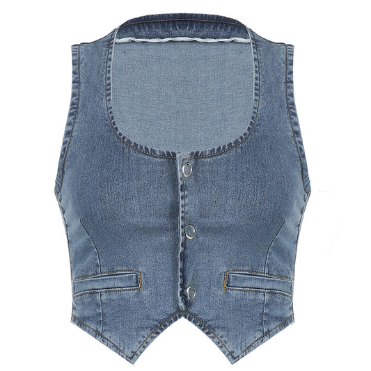 Blue Denim Button Up Tank Top Vest Jacket w/Wrap Strap (Petite)