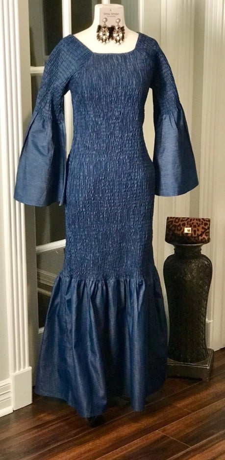 Long denim stretch dress with mid length bell sleeves, square neckline. Smock bodice all around with wide flared bottom.