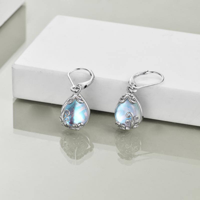 Sterling Silver Moonstone Filigree Teardrop Drop Lever-back Earrings