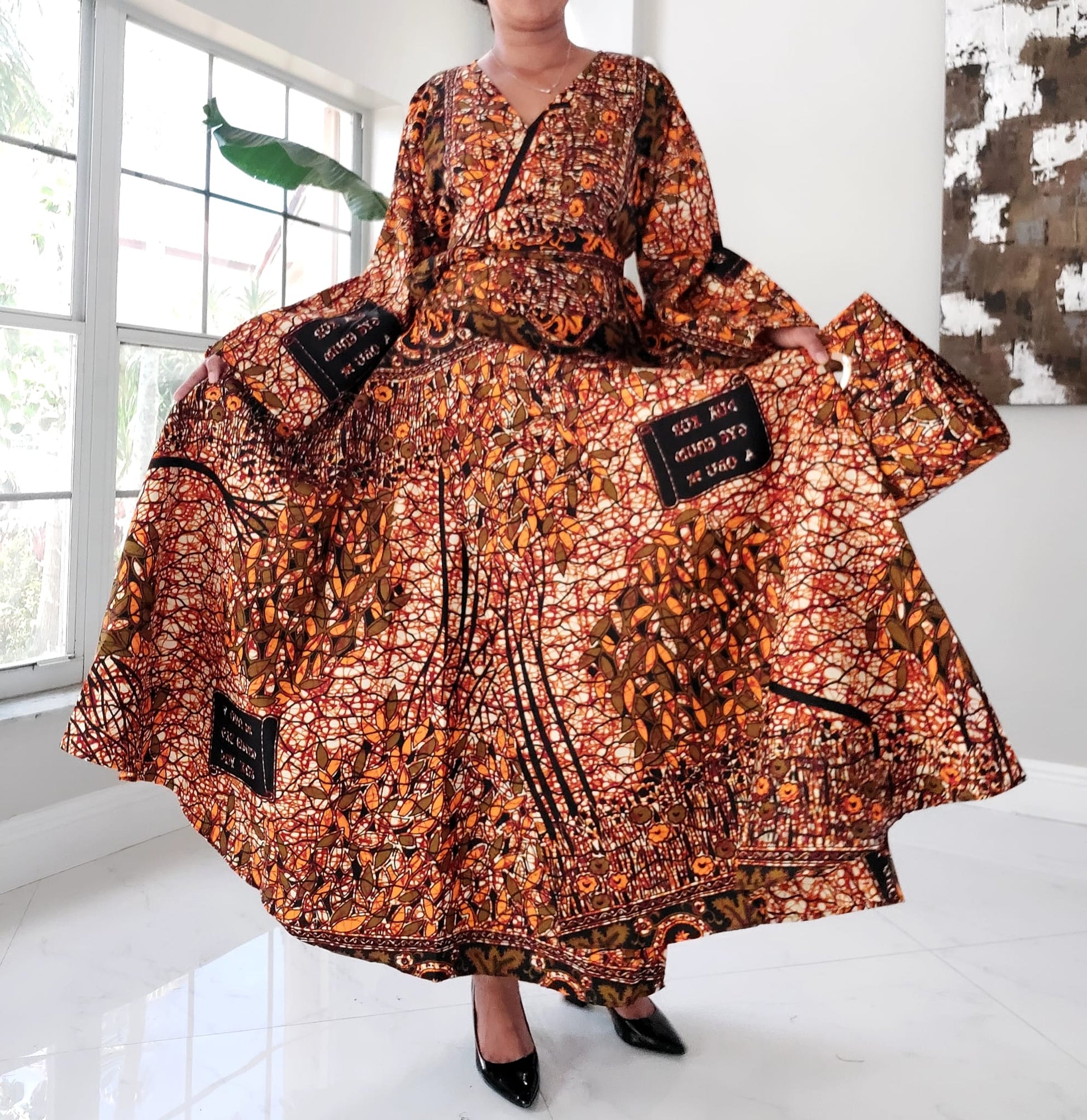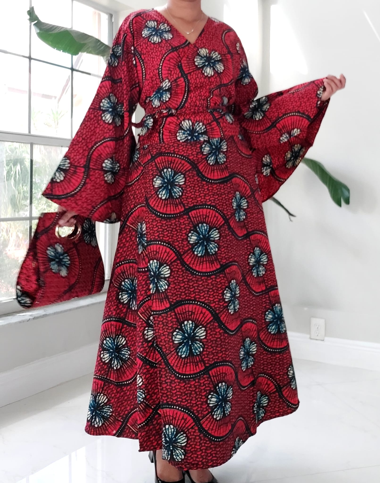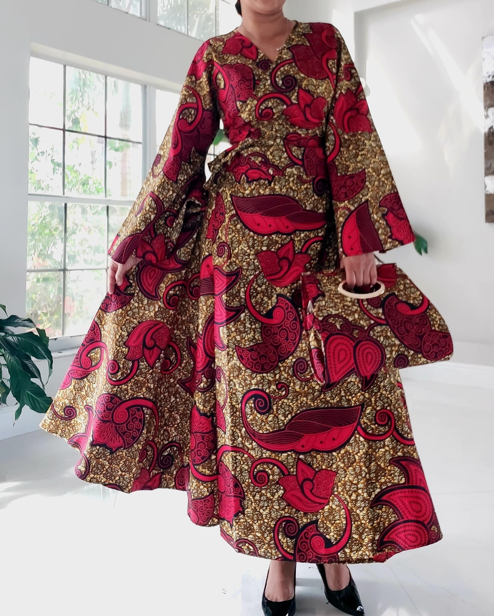 Our NEW Long Wrap Dress Scarf and Pocketbook Set is designed in nine beautiful African pattern styles. Dress is made of 100% wax cotton and has long bell sleeves. Has side pockets and is long ankle length (Image Model is 5"6 tall) Expertly crafted to drape gracefully, this timeless set is made of exquisite fabric and designed to fit comfortably. Make a bold statement with this fashionable set, perfect for everyday and special occasions.