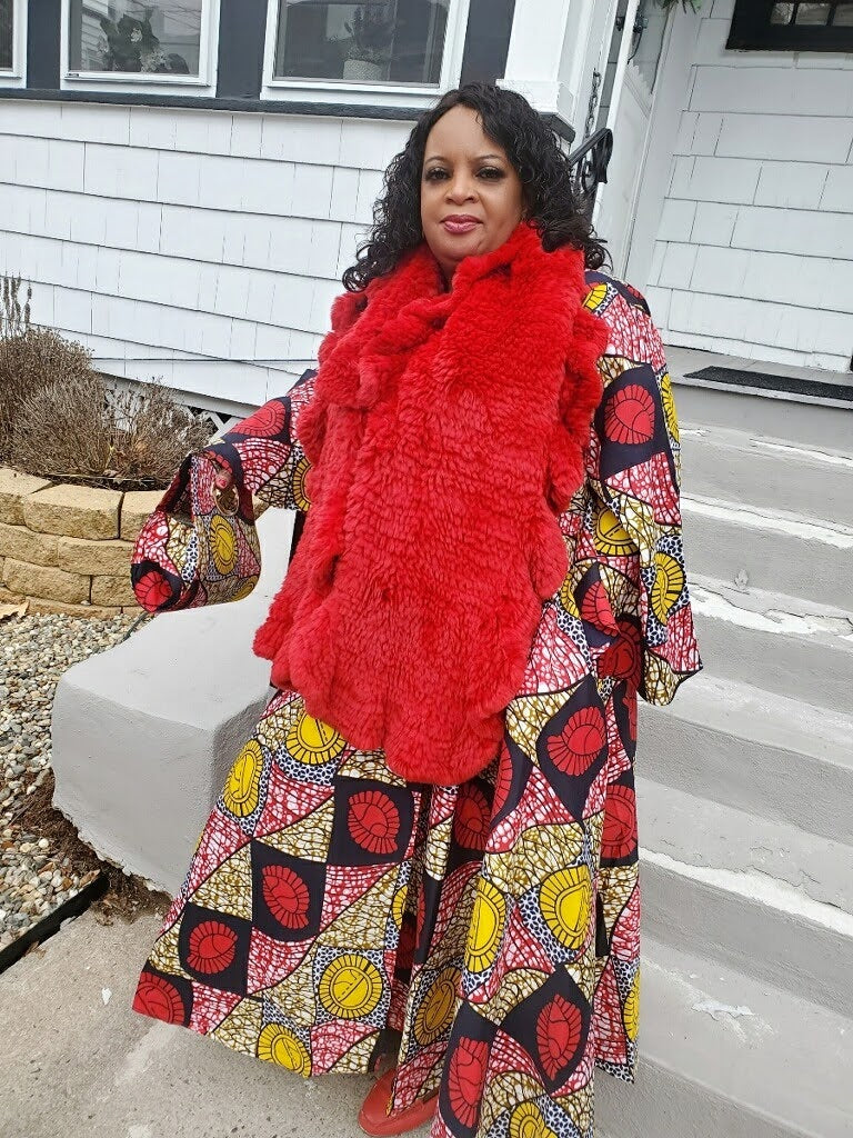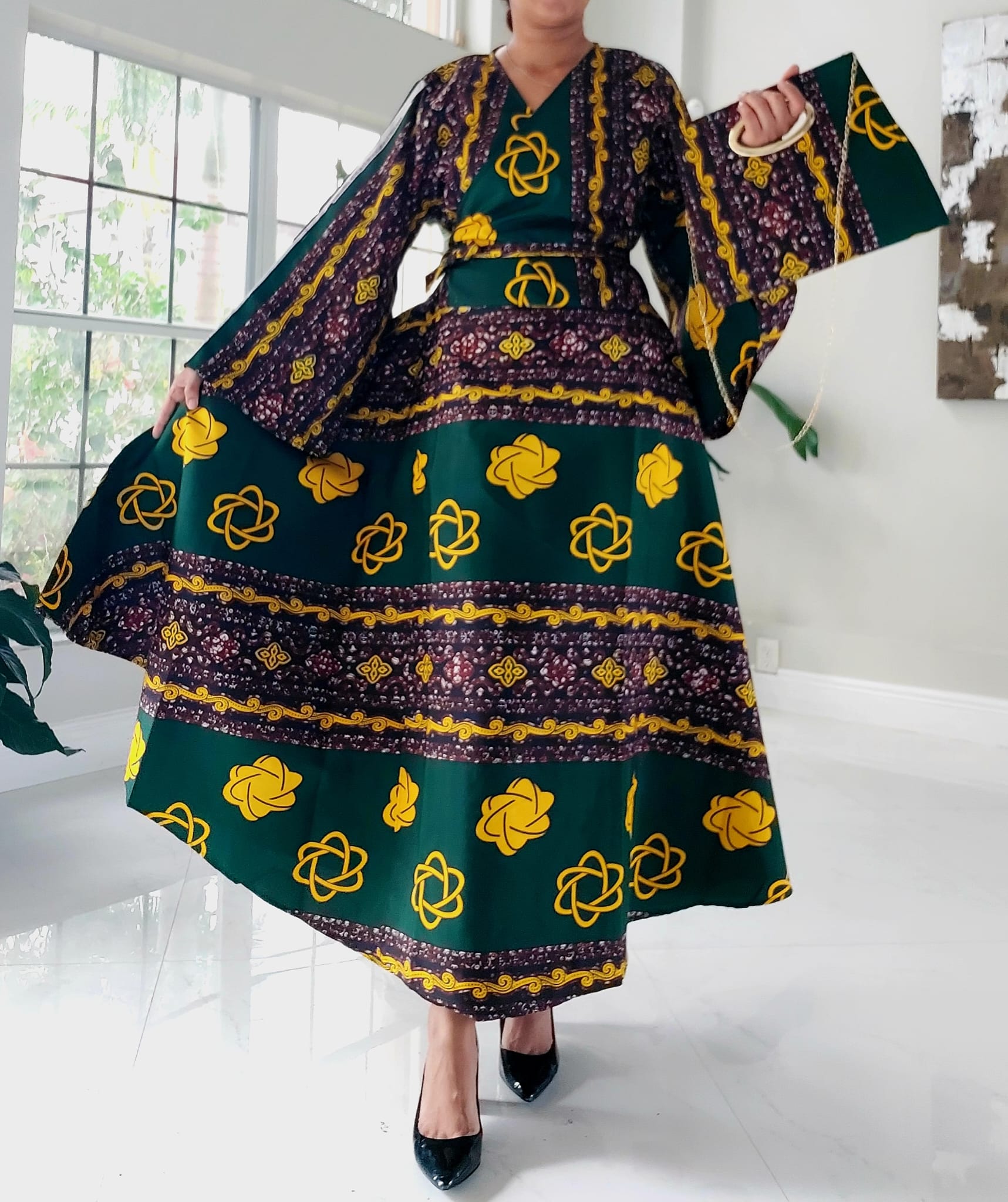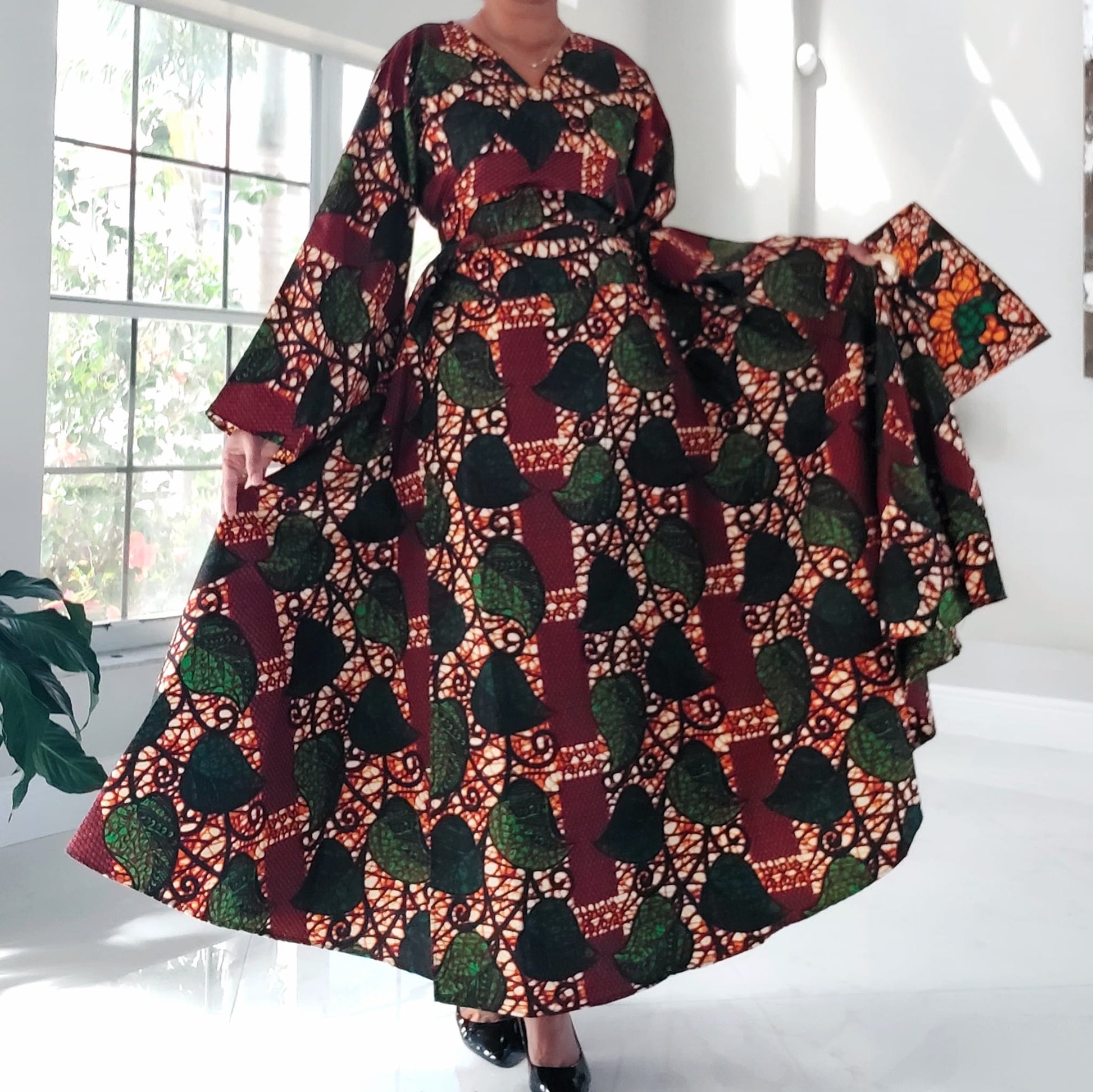 Our NEW Long Wrap Dress Scarf and Pocketbook Set is designed in nine beautiful African pattern styles. Dress is made of 100% wax cotton and has long bell sleeves. Has side pockets and is long ankle length (Image Model is 5"6 tall) Expertly crafted to drape gracefully, this timeless set is made of exquisite fabric and designed to fit comfortably. Make a bold statement with this fashionable set, perfect for everyday and special occasions.