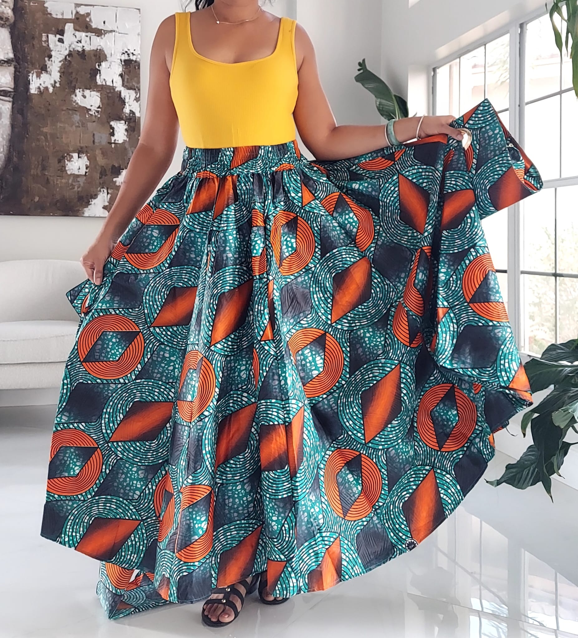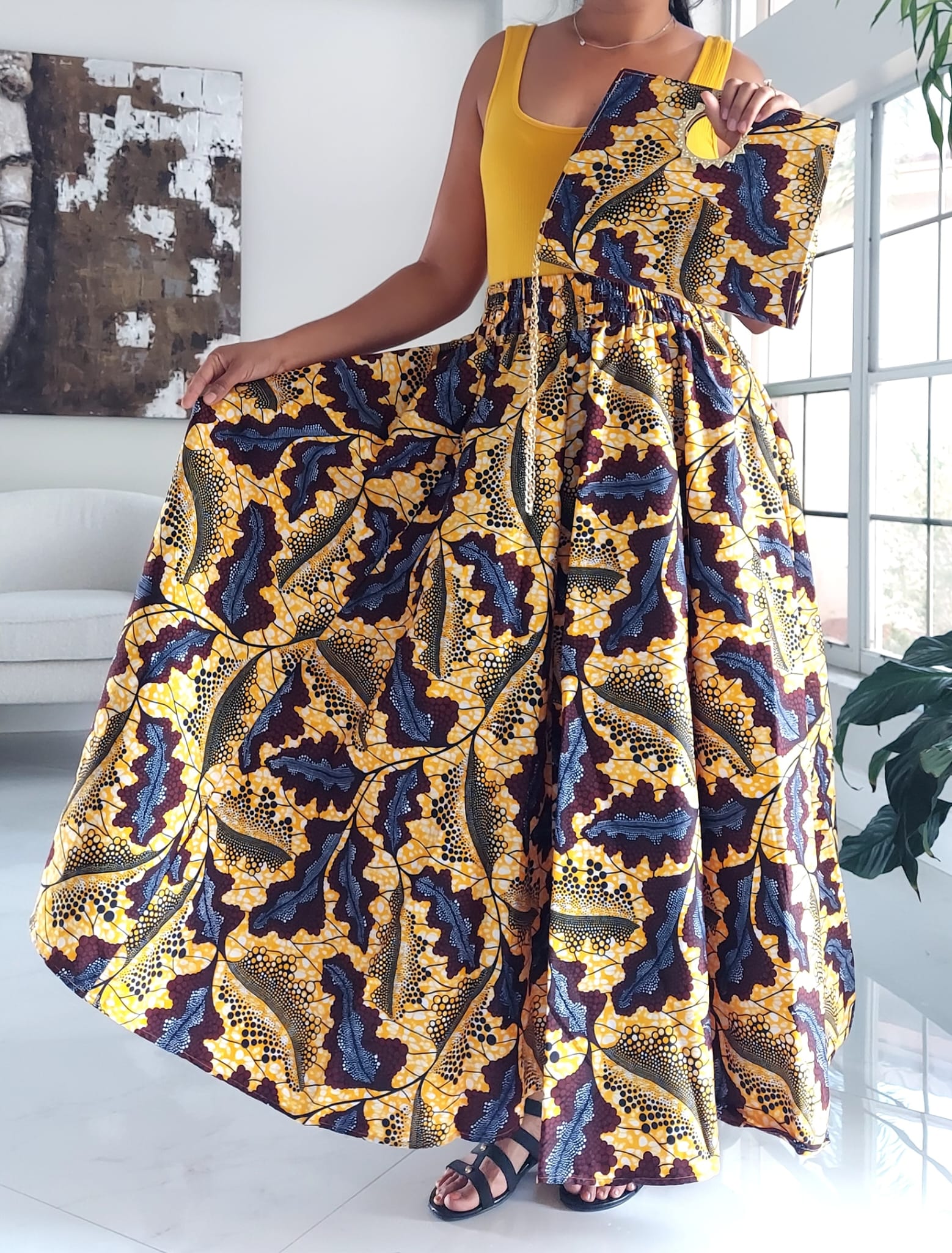 Our NEW Long Skirt, Scarf and Pocketbook Set is designed in nine beautiful African pattern styles. Skirt is 100% wax cotton and has long bell sleeves. Has side pockets and is long ankle length (Image Model is 5"6 tall. Expertly crafted to drape gracefully, this timeless set is made of exquisite fabric and designed to fit comfortably. Make a bold statement with this fashionable set, perfect for everyday and special occasions.