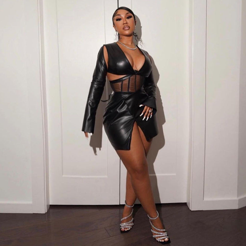 Sheath Mesh Corset Faux Leather Dress