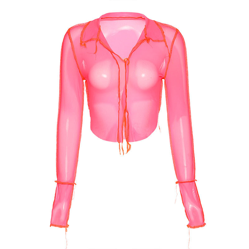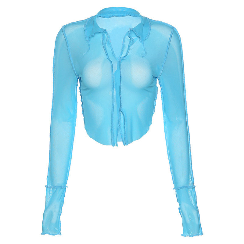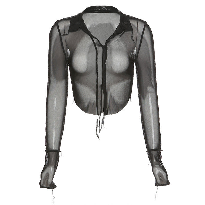 Sheer Long Sleeve Deep-V Slim Top
