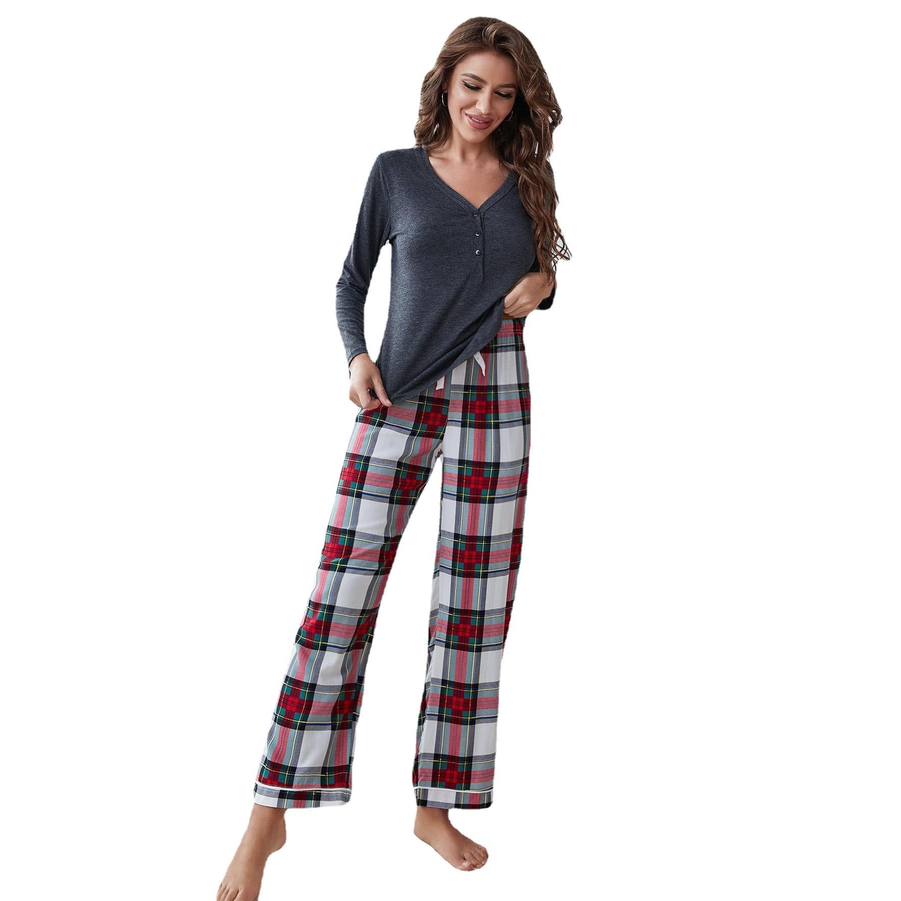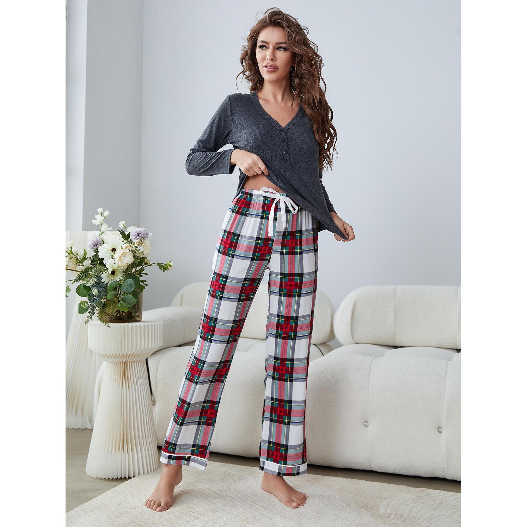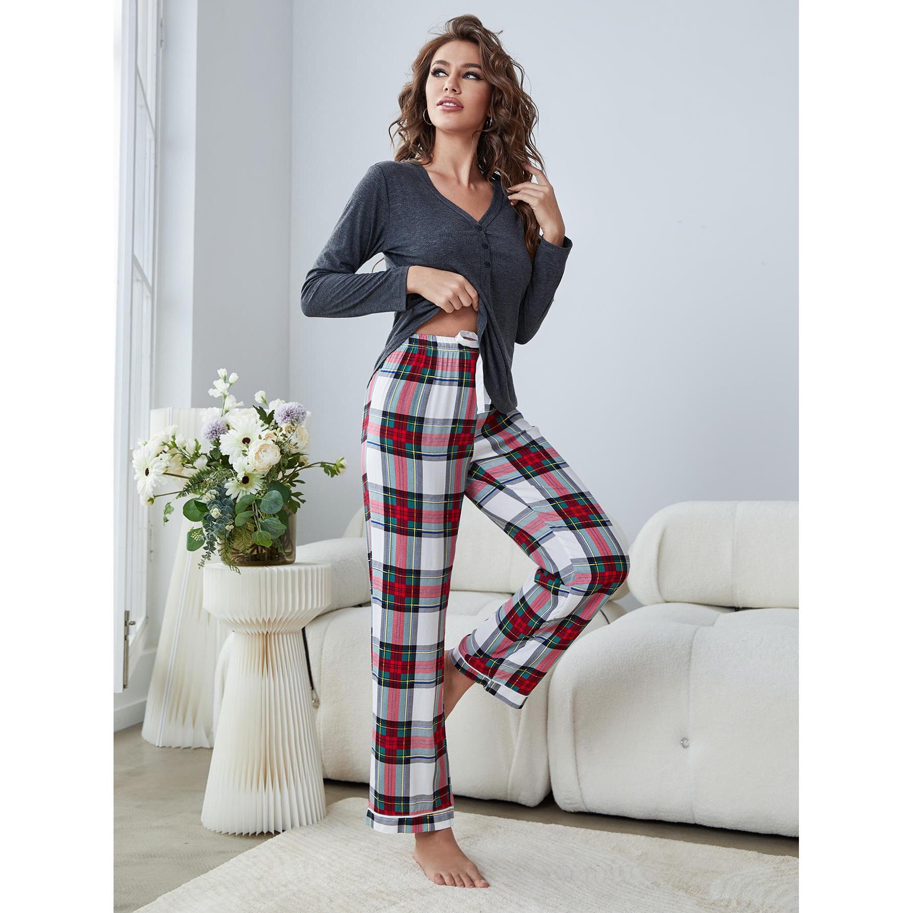 Solid Color Long Sleeve Top and Plaid Bottoms Pajama Set